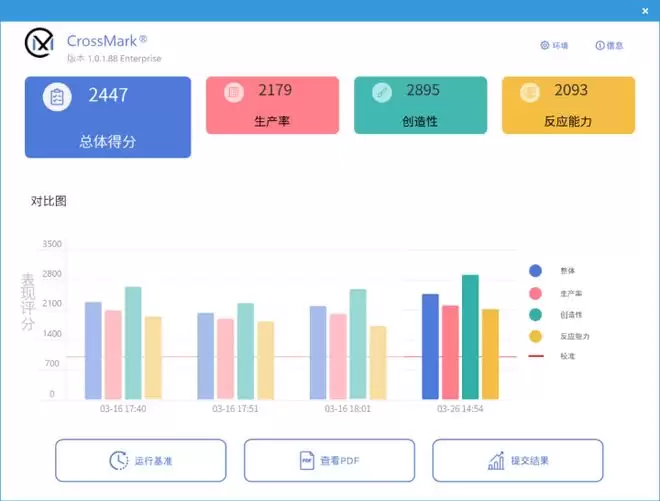 在跨平台的CrossMark(V1.0.1.88)基准测试中,平台总体得分高达2447分,在生产率、创造性、反应能力等三个部分的测试中均处于一流梯队,意味着这台电脑也足以成为视频剪辑、创意设计等专业工作者的生产力利器。