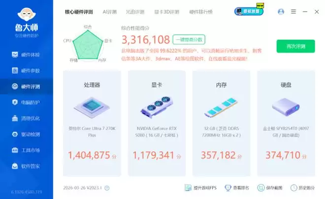 整机性能方面,在鲁大师核心硬件评测中轻松跑到331万分,其中处理器140万分,显卡117万分,内存35万分,硬盘37万分,轻松击败99%的电脑,实力非常强悍。
