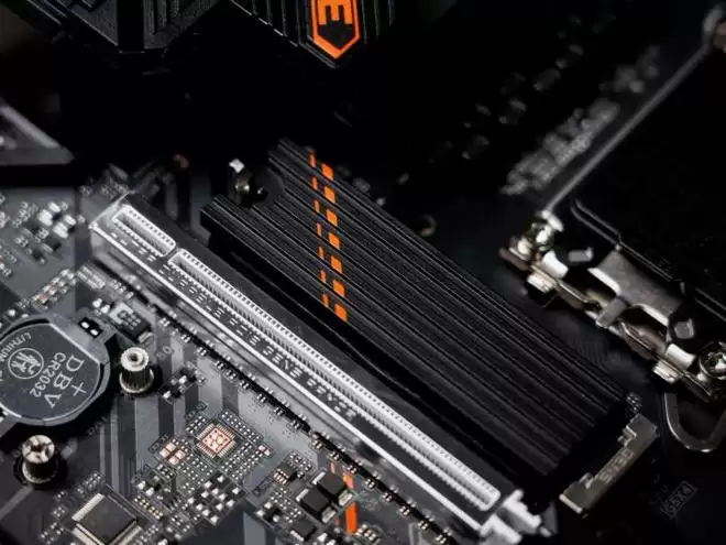 技嘉Z890M战鹰DUO X主板提供5组M.2 SSD插槽,其中1组是CPU直连的PCI-E 5.0x4通道,覆盖厚实的铝制散热装甲,对于PCIe 5.0固态硬盘发热的问题不用担心。其它4组均为PCI-E 4.0规格,内存右边位置同样覆盖了散热装甲,一个小细节是M.2背板还设计了弹性设计,安装时可以紧密贴合硬盘背部,更稳定。