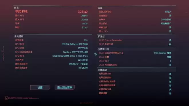 在4K分辨率、高画质、开启光线追踪、DLSS性能档的设定下(如游戏支持则开启4x帧生成),平均FPS在130FPS以上,尽可放心畅玩。