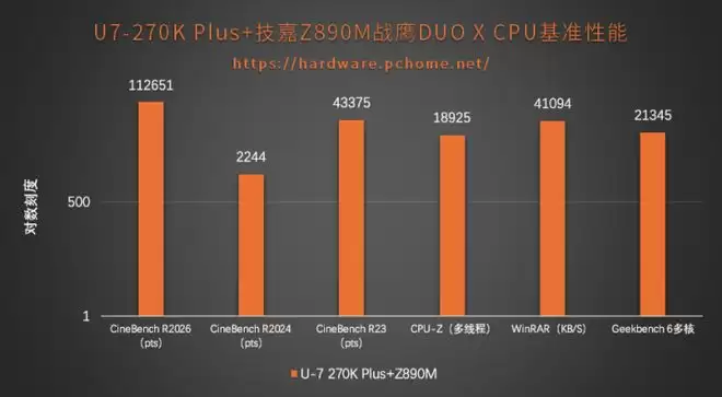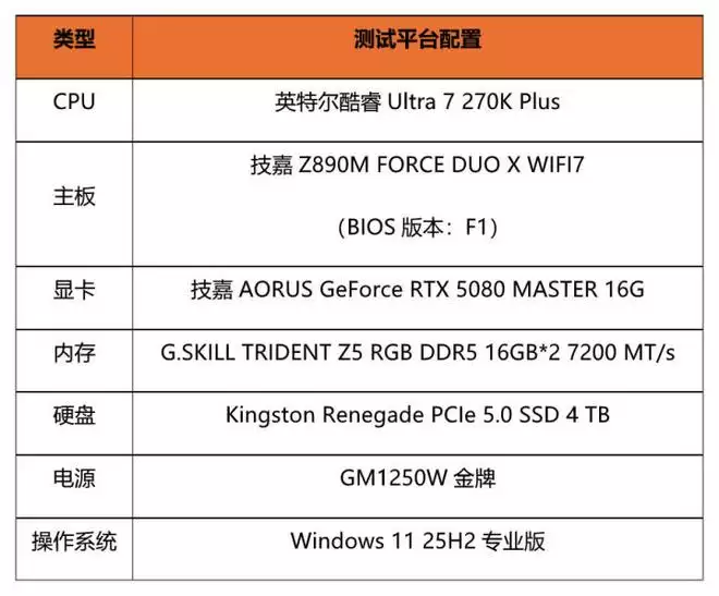 此次测试的平台除了技嘉Z890M战鹰DUO X主板搭配英特尔酷睿Ultra 7 270K Plus处理器之外,还使用了技嘉AORUS GeForce RTX 5080 MASTER 16G显卡等部件,详细配置见表格。(*由于平台优化和软件版本环境不尽相同,下文测试成绩仅代表当前硬件配置在PChome评测室环境下所得)
