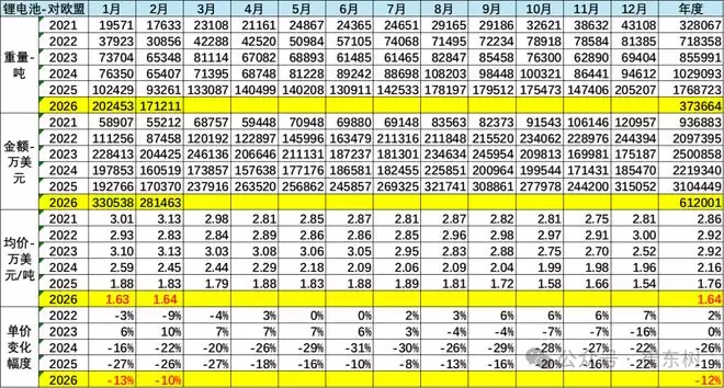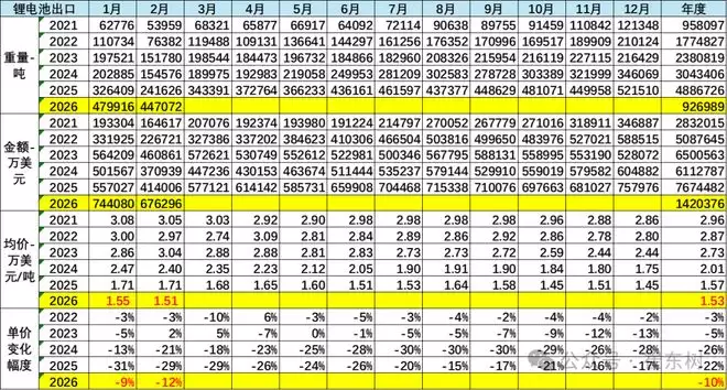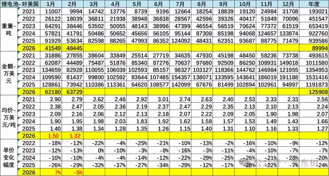 2026年1-2月的锂电池出口92.6万吨,出口额达到142亿美元。从2024年的2.73万美元/吨、2024年的2.01万美元/吨降到2025年的1.57万美元/吨,又降到2026年的1.53万美元/吨,仅下降10%,降幅明显较2024年的降26%和2025年的降22%,改善明显。