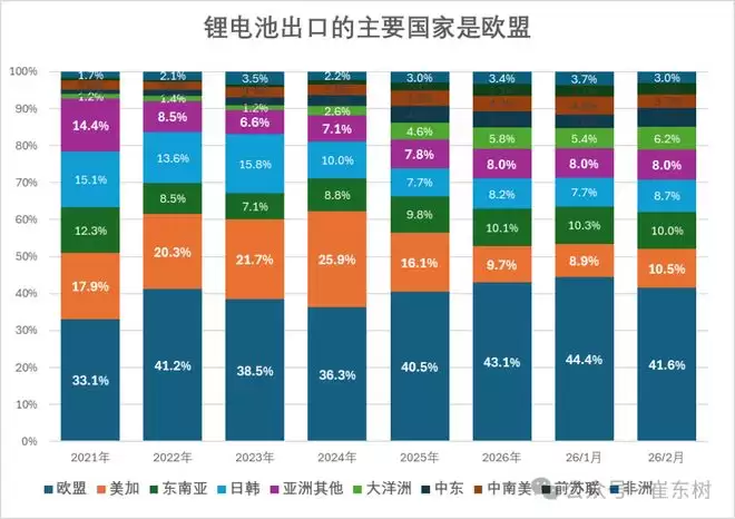 中国锂电池出口的主要市场是欧盟,欧盟的市场需求达到43.1%左右,2026年比2025年增长2.6个百分点。