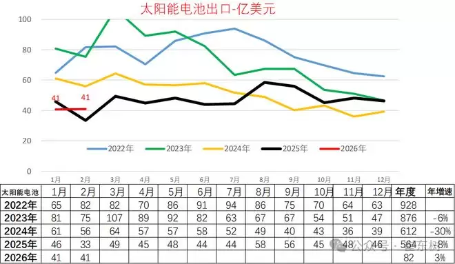 太阳能电池作为新三样的重要优势产品,出口表现波动大,近两年下滑严重,行业内卷严重。太阳能电池应该说在俄乌危机爆发的背景之下,出现了爆发式增长的态势,2020年总体走势相对平稳,而2024年太阳能电池呈现了明显的上升态势,随后2024年太阳能电池又呈现了强势爆发增长态势,达到928亿美元,但2024年随着整体能源形势的相对稳定,太阳能电池的出口回落到876亿美元。2024年下降到612亿美元,2025年下降到564亿美元,降8%。2026年1-2月达到82亿美元,增3%。