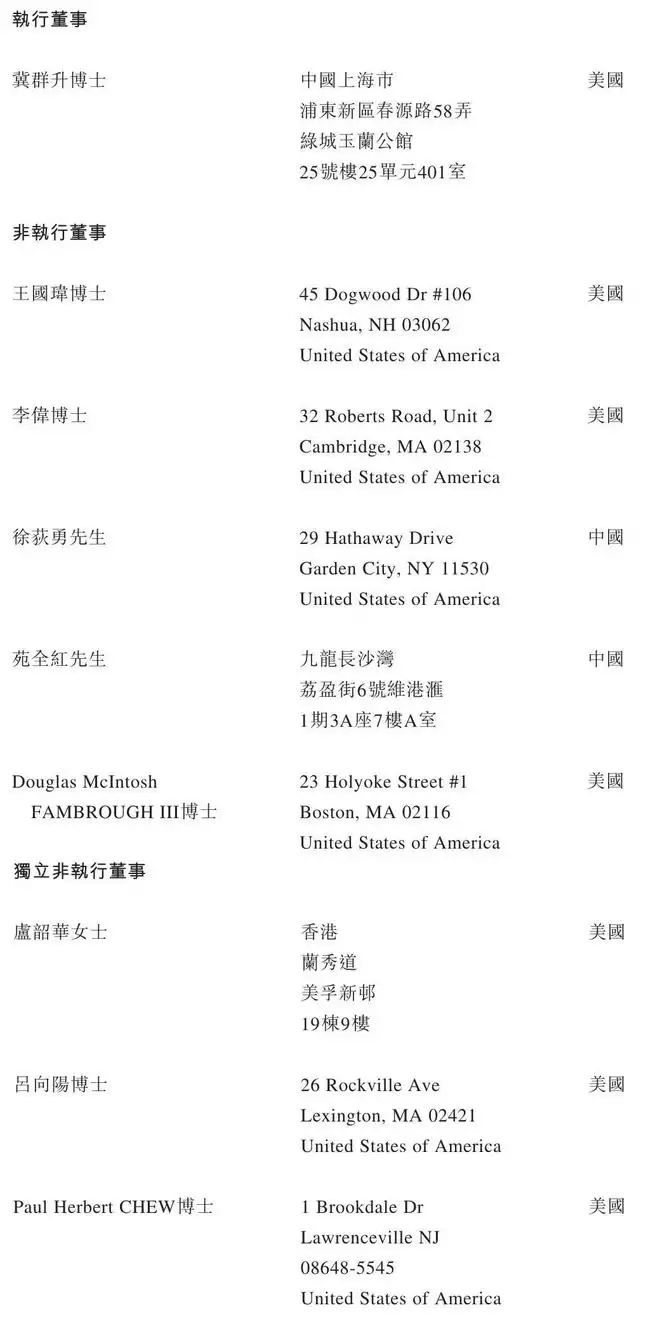 靖因药业执行董事为冀群升博士,非执行董事分别为王国玮博士、李伟博士、徐荻勇、苑全红、Douglas McIntosh FAMBROUGH III博士;独立非执行董事分别为卢韶华女士、吕向阳博士、Paul Herbert CHEW博士。