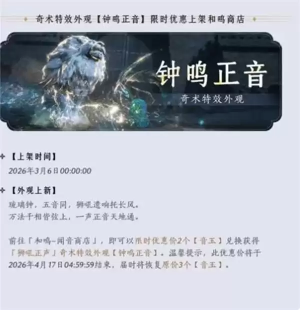 对于主打“狮吼正声”进行输出或控制的玩家而言,「钟鸣正音」具备很高的性价比。它不仅是一套外观皮肤,更能有效提升该技能的视觉辨识度与听觉沉浸感,使每一次吼出都更具武侠仪式感。若你希望为自己的声波功法增添一份古朴厚重的神韵,趁当前限时折扣入手无疑是明智之选。