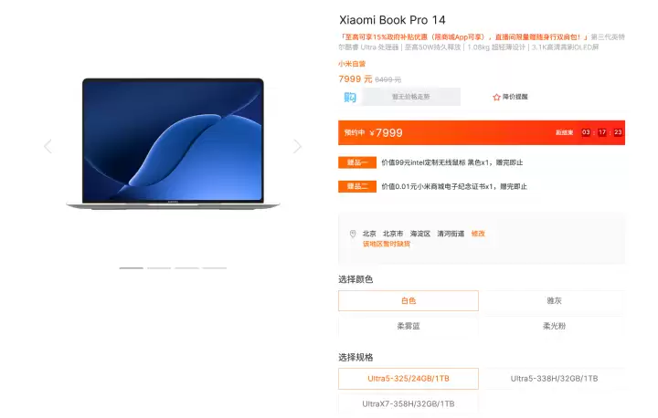 最后提供详细的版本与售价信息。Xiaomi Book Pro 14此次发布三个配置:搭载Ultra 5 325处理器、24GB内存与1TB SSD版本售价8499元;Ultra 5 338H处理器、32GB+1TB版本售价9699元;顶配的Ultra X7 358H处理器、32GB+1TB版本售价10499元。首销期间各配置均享500元限时优惠,优惠后起售价为7999元。在支持国家补贴的地区,叠加15%补贴后,入门款实际到手价可低至6799.15元。购机用户还将获赠价值898元的尊享服务包,内含1年延长保修、180天只换不修以及5年1次电池免费焕新等权益,为长期使用体验提供了坚实保障。