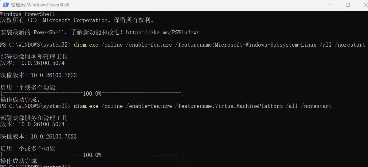 在管理员PowerShell中依次执行以下两条命令来启用核心功能: