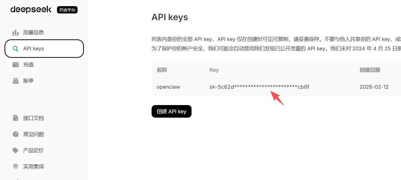 本镜像默认集成DeepSeek云端API接口。你需要访问DeepSeek开放平台,注册并登录账户后,在API管理界面创建新的API密钥。平台为新用户提供免费额度,足以满足日常测试和使用需求。密钥创建成功后,请立即复制并安全保存该Key,关闭页面后将无法再次查看完整密钥。