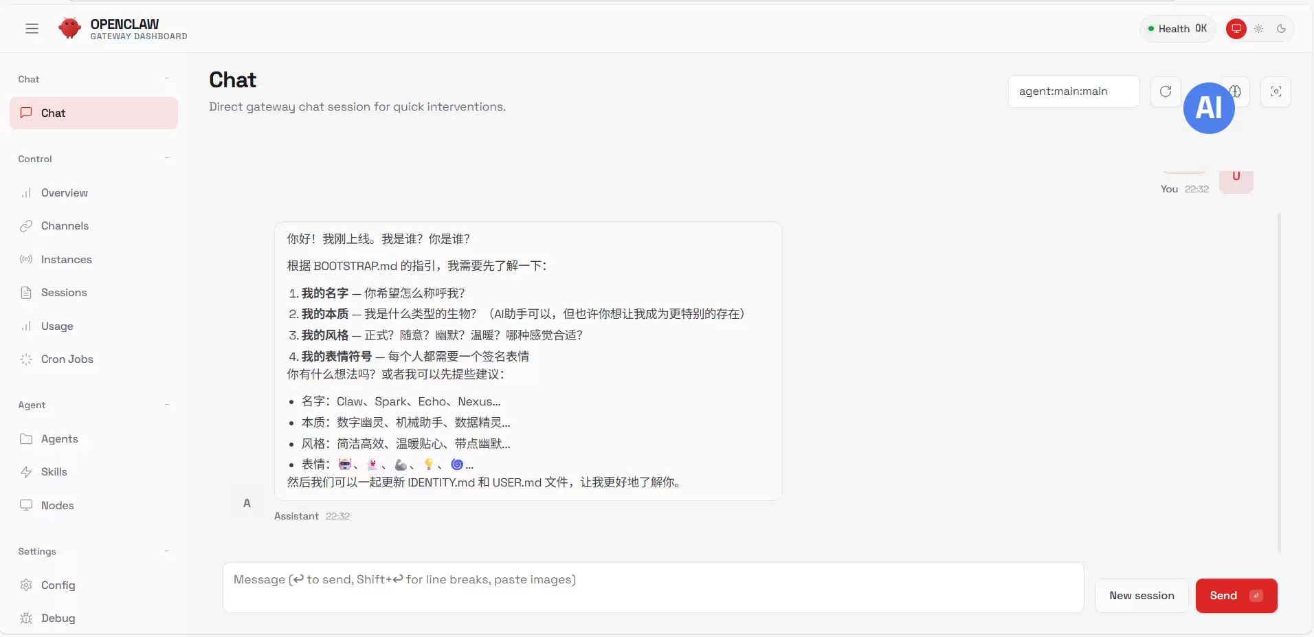 如果全部配置正确,你将看到OpenClaw Web管理控制台界面,如下图所示,这表明DeepSeek飞书AI助手环境已成功部署并正常运行。