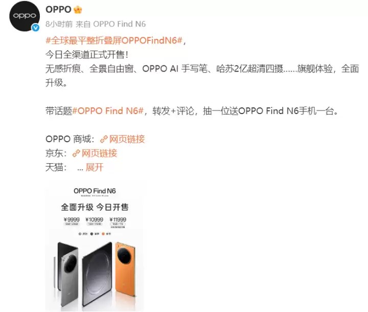 OPPO Find N6全面开售 1TB大存储版本火速售罄