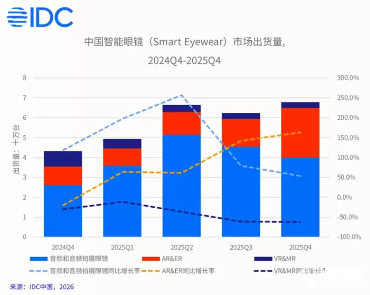 市场增长的强劲势头,在最新行业数据中得到了充分验证。国际数据公司(IDC)发布的《全球智能眼镜市场季度跟踪报告》显示,2025年全球智能眼镜市场表现卓越,全年出货量攀升至1477.3万台,较去年同期大幅增长超过44%。其中,中国市场成为关键的驱动引擎,整体表现尤为突出:全年出货量达到246万台,同比增速高达87.1%;仅第四季度单季出货量就贡献了67.9万台,实现了57.1%的同比增长。