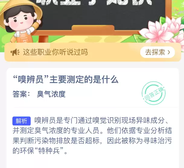 今日我们来探讨一个颇具特色的冷门职业。蚂蚁新村4月1日最新题目是:“嗅辨员”的核心工作内容是什么?标准答案是:测定臭气浓度。