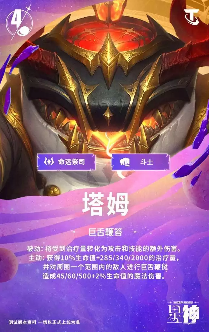 在云顶之弈S17赛季中,塔姆作为经典的前排英雄强势归来。其核心技能“巨舌鞭笞”引入了创新的伤害转化机制,使其不仅具备强大的生存能力,更化身为能抗能打的战场核心,强度表现备受玩家期待。