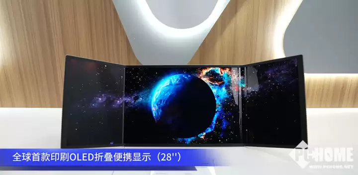 同时,印刷OLED的柔性特性也得到了充分发挥。现场展示的全球首款印刷OLED折叠便携屏极具创意:折叠状态下的设备厚度仅为4.48毫米,折叠时为16英寸屏幕,展开后则变为一块28英寸的超宽带鱼屏,使用场景灵活多变。它配备了全球最大尺寸的水滴型铰链和一体式背部支架,支持横屏、竖屏及多角度自由悬停,完美适配移动办公、内容创作与大屏娱乐等多重需求。