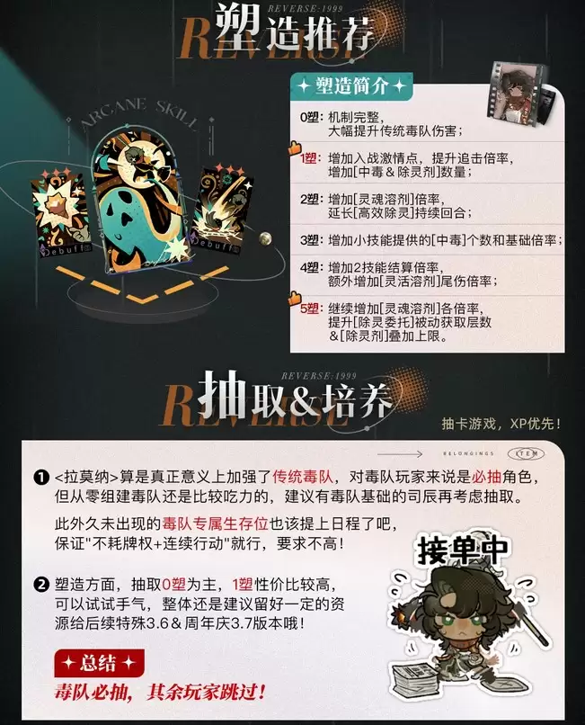 总结而言,拉莫纳的技能体系设计精妙,环环相扣。她通过【附灵】改写触发追击,利用【针对顽固派】等技能快速铺设【中毒】与【除灵剂】,再借助【除灵委托】与【除灵剂】的联动效应指数级放大中毒伤害,最终以【灵魂溶剂】实现残局清场。透彻理解这一整套连招逻辑,你便能真正释放出这位中毒体系核心角色的全部潜力,在《重返未来1999》的战场上无往不利。