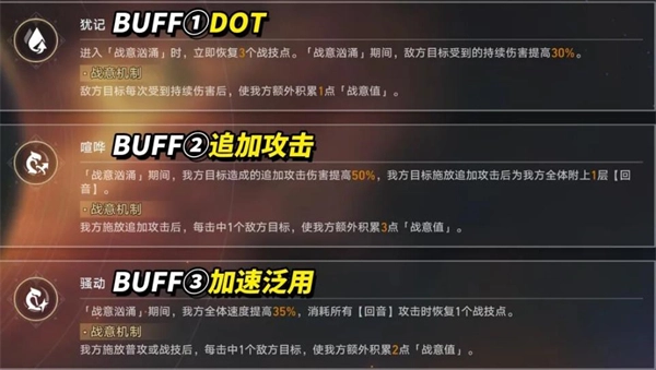 「骚动」 具有最强的普适性。普攻或战技每命中一个目标提供2点战意。战意汹涌状态下,我方全体速度提升35%,且每次消耗【回音】层数时可回复1个战技点,对几乎所有流派队伍都是关键的续航与节奏保障。
