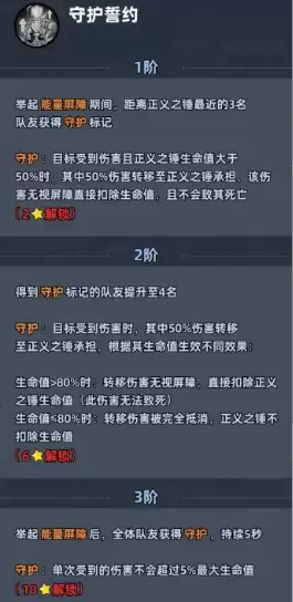 该技能在提升至3星后效果质变:不仅【守护】标记的目标数量增加,还会为正义之锤自身提供持续的生命恢复效果。当升至7星满级时,则会大幅提升屏障的初始充能效率,并为攻击附加破甲效果,真正实现攻防一体的战略价值。