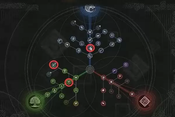 在技能树分配上,请优先点出图中红色圆圈所标注的几个关键技能,它们直接关系到爆炸箭的伤害和循环效率。