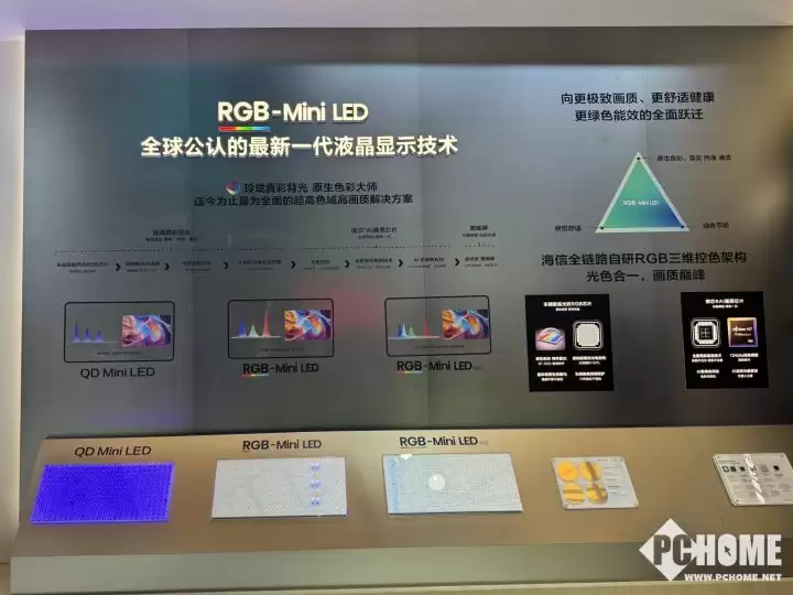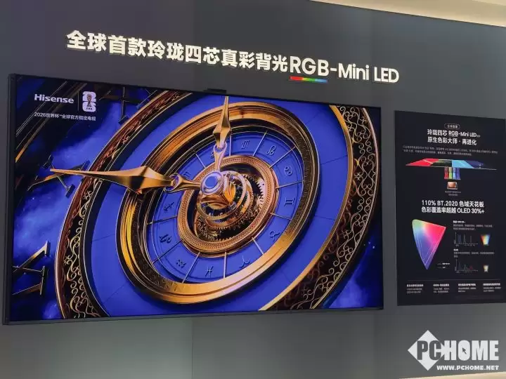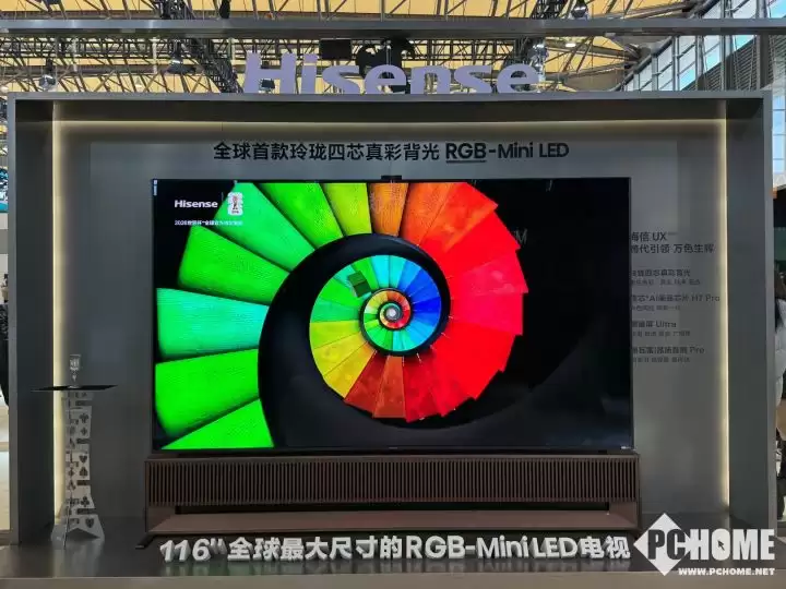 现场人气最为火爆的区域,陈列着海信全新发布的世界杯定制旗舰系列。以旗舰级RGB-MiniLED电视UX 2026款为例,该产品汇聚了七大行业首创技术:包括玲珑4芯真彩背光系统、搭载四芯同控架构的信芯AI画质芯片H7 Pro、具备4倍黑位显示能力的超低反黑曜屏Ultra,以及180Hz原生高刷新率等。这一系列尖端科技的融合,成功解决了MiniLED领域长期存在的串色、光晕及色彩偏差等行业共性难题。
