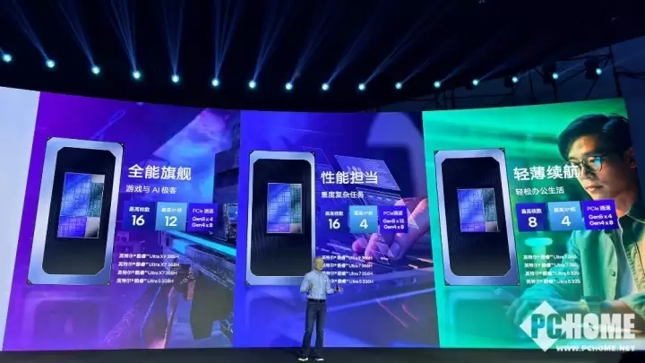 对于追求顶级性能的用户,定位高端的酷睿Ultra X系列提供了更强的每瓦性能与图形表现。与此同时,全新的16核配置为PC制造商赋予了更高的设计灵活性,既能打造极致轻薄的性能本,也可搭配独立显卡构建高性能“小钢炮”游戏本。此外,平台在I/O扩展性上也进行了全面优化,通过提供丰富的PCIe 4.0与PCIe 5.0通道,为高速NVMe固态硬盘及高性能独立显卡提供了充裕带宽,确保视频剪辑、3D渲染等高负载任务流畅无阻。
