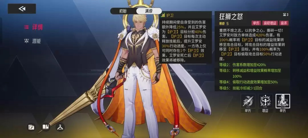 艾罗安拥有118的基础速度,刚好略高于大部分主流“超火”输出,但在辅助定位中并不算顶尖。他的强大源于技能机制的全面性与高倍率。其一技能的效果量极为扎实,几乎等同于其他SSR角色一技能的1.5倍,附带的每一项效果都是实战中的实用神技。其三技能则堪称精华所在,融合了维罗妮卡与渺渺三技能的核心机制。该技能集合了双向拉条、单体破甲、负面状态转移、增益效果偷取、护盾施加、减伤提供、伤害分摊以及行动条窃取于一身。从技能设计上就能看出其战略价值,泛用性高,是队伍中不可或缺的核心战术拼图。