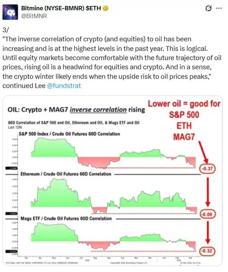 “加密货币与股票对石油的反向相关性正在加剧,并且已经达到了过去一年的最高水平,”李进一步解释道。