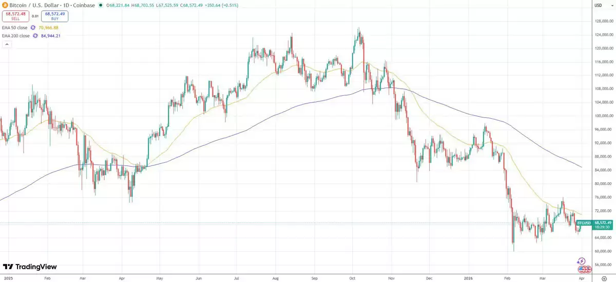 眼下,比特币仍运行在关键的50日和200日指数移动平均线下方,这两条均线是判断长期趋势的核心技术指标。目前价格徘徊在200周均线(约68,000美元)附近,而在之前的市场下跌中,这条均线曾多次充当关键支撑。能否在此位置企稳,是市场接下来关注的重点。