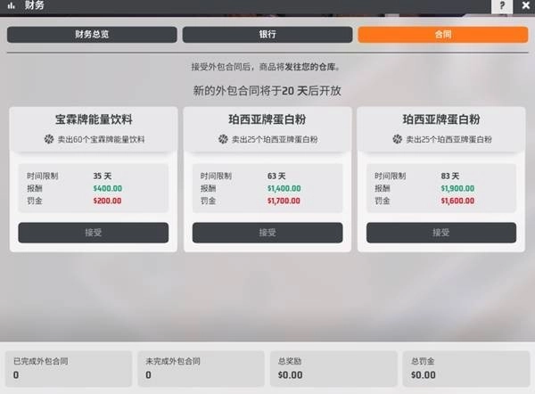 合同任务是前期积累资金的高效途径。优先承接奖励丰厚的合同订单,然后针对合同要求的特定商品,集中进行广告营销推广,加速该商品的销售流程以按时完成合同,从而赚取高额任务奖金。