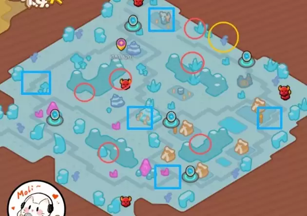 - 蓝色标记(蓝圈):指示冰柱的刷新位置。击碎冰柱是获取“雪花”状态唯一方式。