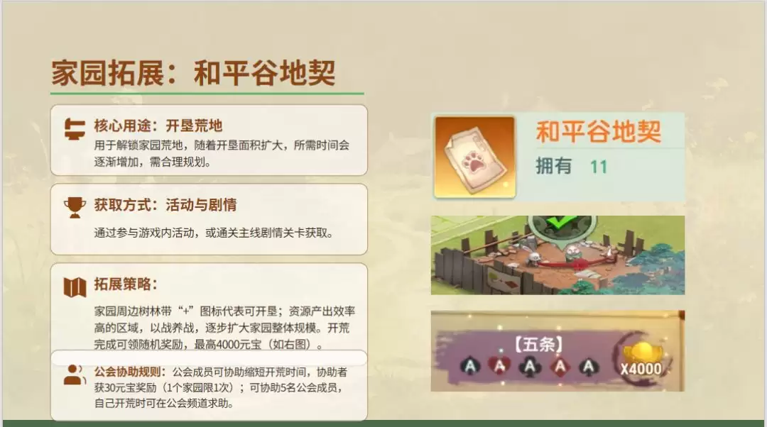当初始空间捉襟见肘时,“和平谷地契”便是您的解决方案。使用地契可以解锁全新的区域,获得更多宝贵的土地,用于建造额外的生产建筑或摆放装饰物。地契的获取渠道多样,包括推进主线剧情、参与限时活动或达成特定成就。合理规划扩展顺序与区域功能,能让您的家园布局更加流畅高效。