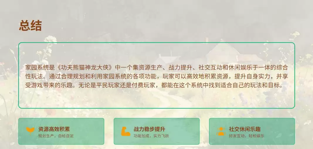 总而言之,《功夫熊猫:神龙大侠》中的家园系统远非一个简单的附属玩法。它是一套深度融合了资源规划、任务引导、社交趣味与个性装扮的复合型经营体系。深刻理解其“生产-加工-兑换-提升”的内在循环逻辑,并平衡好每日的精力与资源分配,您将不仅能成长为一代盖世神龙大侠,更能亲手打造并经营好一片令人心驰神往的和平谷桃源胜地。
