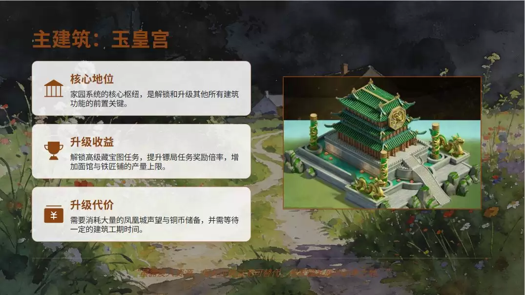 玉皇宫是您家园的“门面”与绝对核心。它的等级直接决定了其他所有建筑的可升级上限,并深刻影响家园的整体繁荣度评分。提升玉皇宫等级往往需要消耗海量基础资源与特定稀有道具,这意味着一个长期的资源规划过程。因此,如何分配资源、确定升级优先级,围绕玉皇宫制定的发展方略,就是您家园经营的总体纲领。