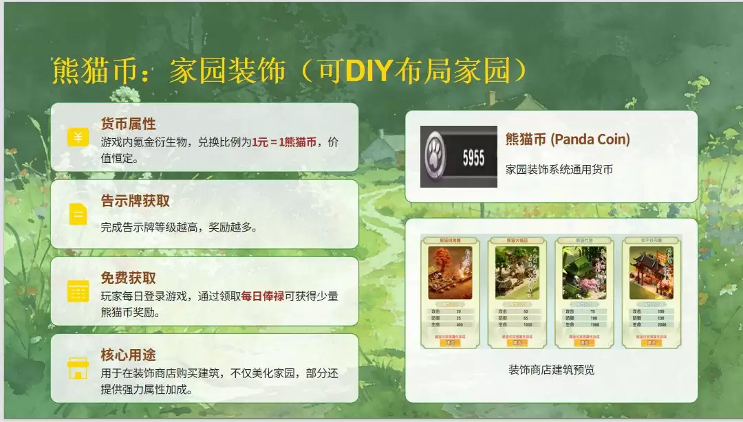 辛苦积累的熊猫币,其最重要的消耗点在于家园专属商店。在这里,您可以购买各式各样的精美装饰品、独特的建筑外观皮肤以及珍稀的功能性配方图纸。这才是真正彰显您个人审美与创造力的舞台——打造一个与众不同、专属于您的和平谷秘境。换言之,熊猫币是实现您家园个性化“高端定制”梦想的关键货币。