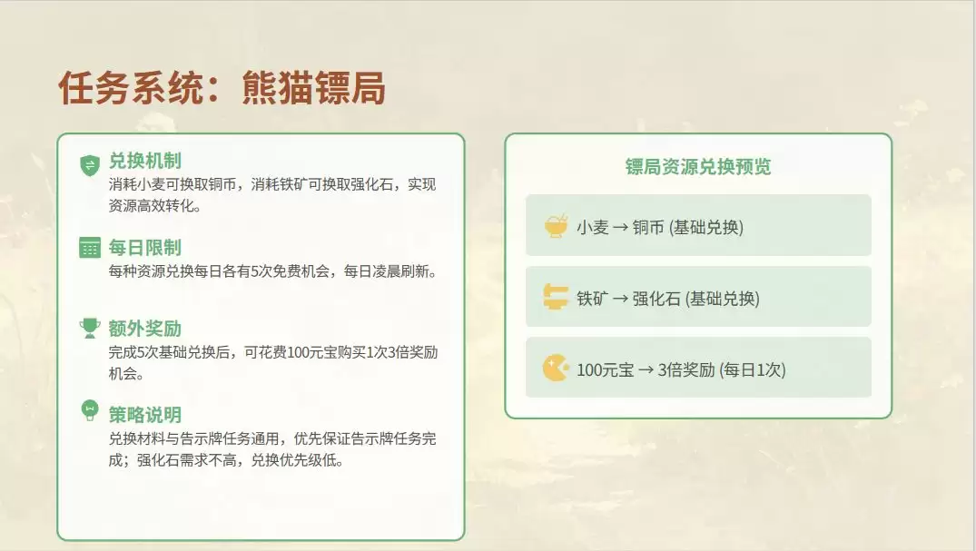 如果说告示板任务偏向“文职”,那么熊猫镖局提供的则是“武职”差事。这里发布的往往是护送、剿匪等需要一定战斗实力的挑战性任务。其奖励也通常更为丰厚,时常包含稀有强化材料、特殊家具或限定装饰。这不仅仅考验您的家园管理能力,更直接检验您作为神龙大侠的实战功夫。