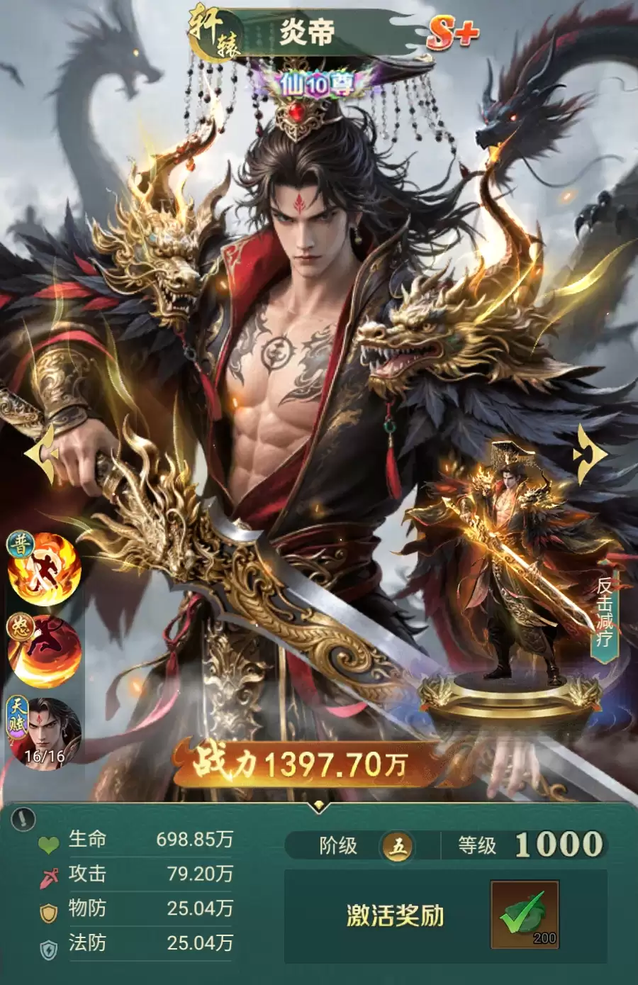 炎帝的培养潜力巨大,高星级觉醒将带来质的飞跃。当其升至九星时,将解锁新的生存能力:每受到四次普通攻击,即可触发一次自我生命回复。这一续航特效显著提升了他在持久战中的坦度。而当他突破至真仙一重境界后,将迎来真正的蜕变——无论是受到普攻还是技能伤害,都有几率触发反击效果。设想一下,作为承受大量伤害的前排,炎帝在一回合内多次触发反击是常见情况。单次反击伤害基于目标最大生命值的5%,看似不高,但在高频率触发下,其累积的总伤害输出会变得极为可观。达到此境界的炎帝,足以胜任队伍中的核心副输出乃至主输出位。