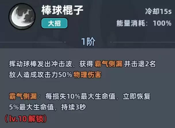 终极技能【棒球棍子】拥有15秒冷却,需消耗满额能量释放。一阶效果为挥舞球棍释放冲击波,击退两名敌人并造成其50%生命值的物理伤害,同时开启核心增益状态——【霸气侧漏】。在此状态下,极道大佬每损失10%的最大生命值,便会立即回复5%的最大生命值,形成“受击越狠,回复越强”的独特循环。
