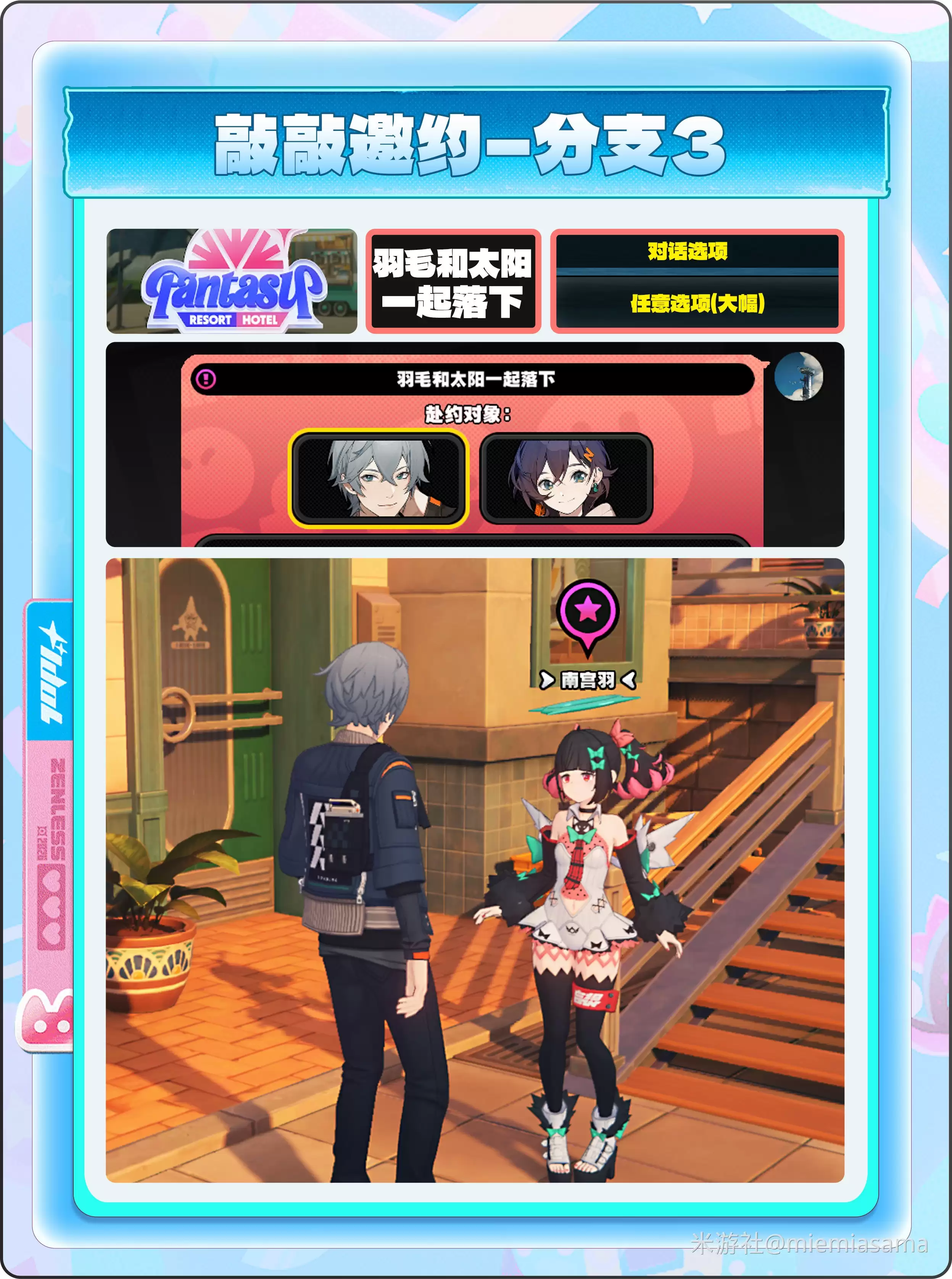 这场邀约的目的地在风景优美的【绮梦度假村】,主题为【羽毛和太阳一起落下】。其机制与分支二相似,流程简洁。在对话中作出任意选择后,信赖度同样会迎来一次“大幅”提升。轻松惬意的度假村氛围,成为了增进感情的绝佳背景。