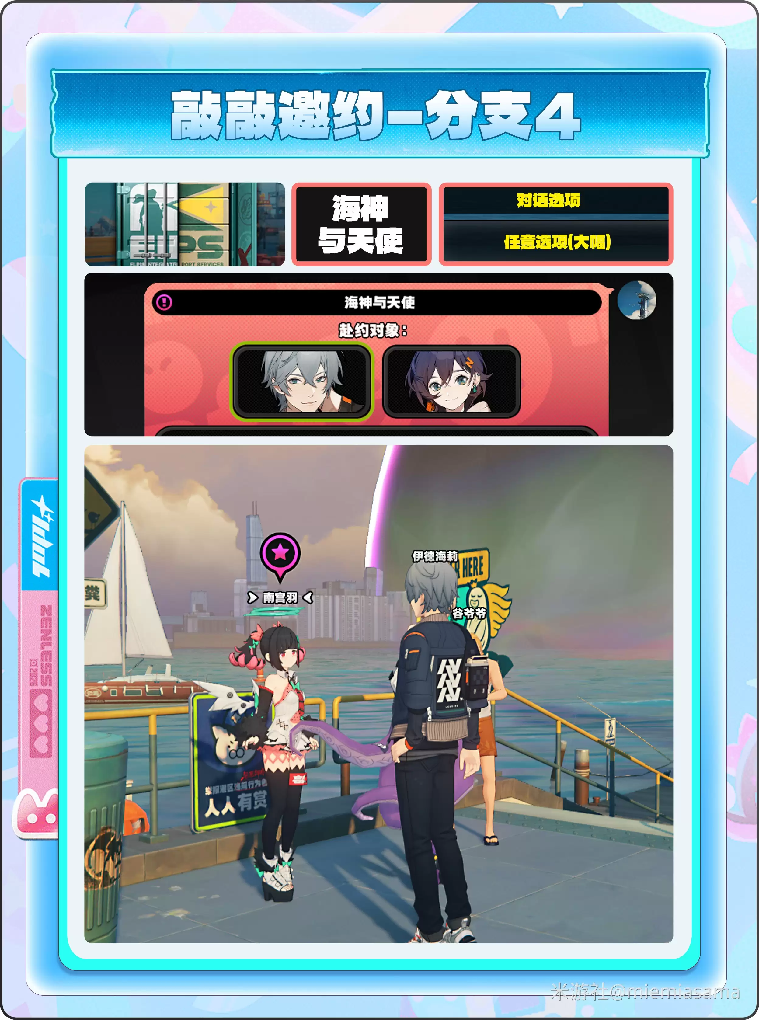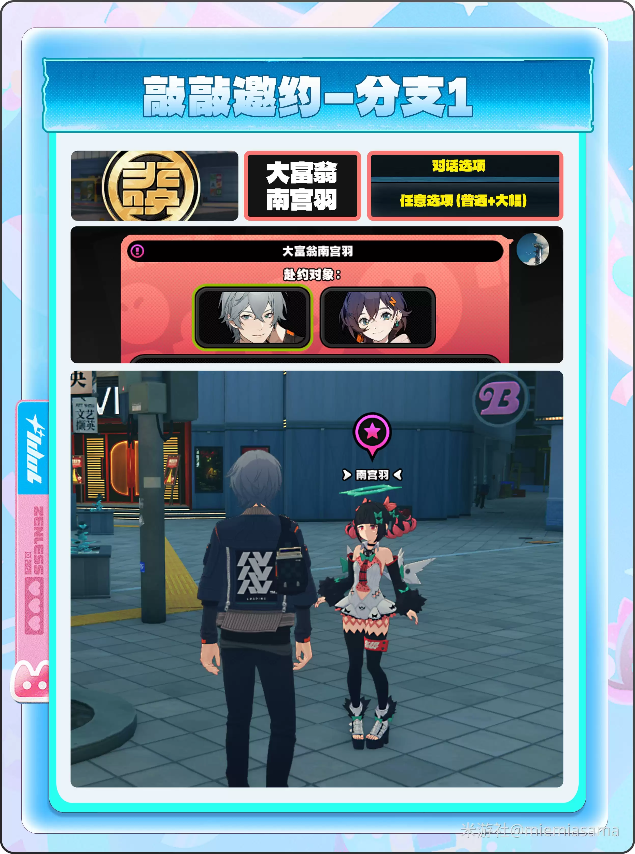 在《绝区零》中,要想快速提升与角色南宫羽的亲密度,邀约事件是效率最高的核心途径。与随机触发的街头偶遇相比,邀约不仅流程可控,所能获得的信赖度回报也更为丰厚。本文将为你完整解析南宫羽的所有邀约事件,从触发地点、选项机制到信赖度收益,助你科学规划,高效提升与这位“天使”的羁绊等级。