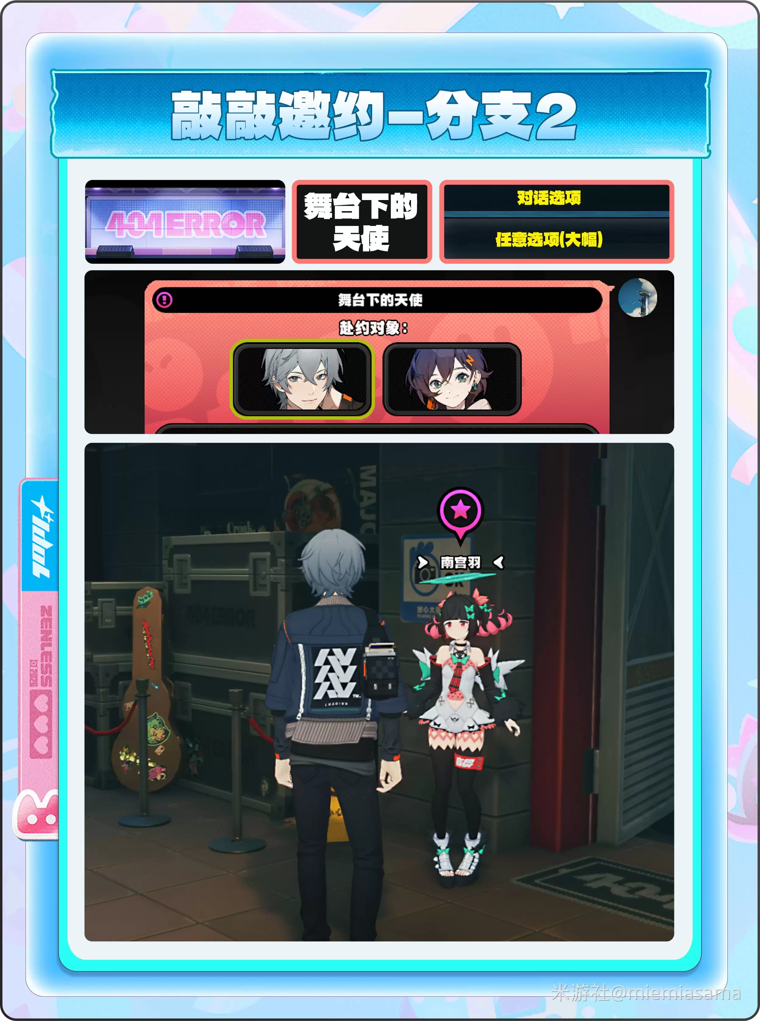 此邀约发生于【404LIVE】,主题是【舞台下的天使】。流程直接高效,核心关键在于对话选项。玩家在选择任意一项后,即可一次性获得“大幅”信赖度提升。目标明确,无需复杂操作,是快速积累信赖度的优选。