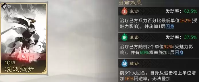 主动技能极力推荐【凌波微步】。为己方兵力最低的单位提供治疗并赋予一次“闪身”效果,能极大程度防止核心武将遭秒杀,显著提升阵容的持续作战能力与容错率。