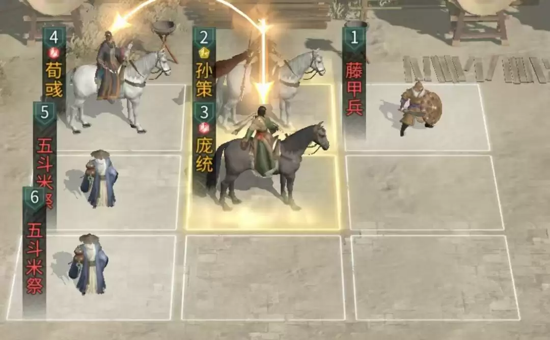 兵种布置同样关键:在荀彧下方配置两名五斗米祭坛,并于孙策前方部署一名藤甲兵。此布局能为队伍提供优异的生存与续航支持,保证核心输出环境。