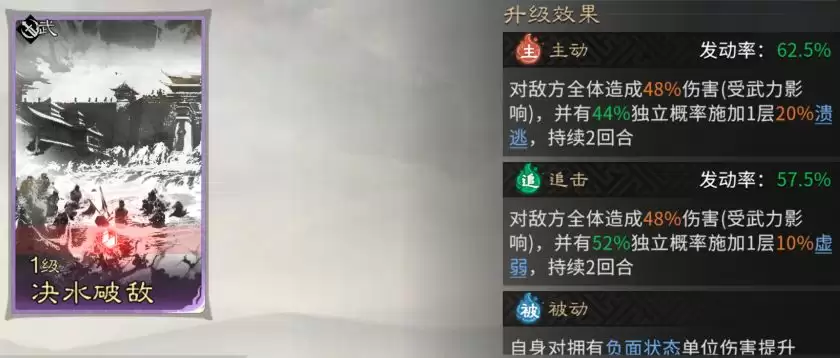 主动技能必带【决水破敌】。对敌军全体造成范围伤害并附加【溃逃】状态,完美契合队伍“快速压低群体血线”的核心战术诉求。