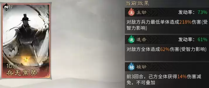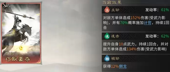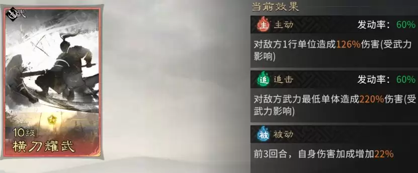 追击技能锁定【横刀耀武】。此技能会精准打击敌方武力最低的单位(通常是辅助或谋略型脆皮武将),旨在快速定点清除这些关键战术节点,实现战场破局。