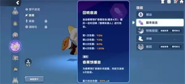 该机器人每4秒发动一次协奏伤害,并能够提升目标所承受的持续伤害效果。因此,他的核心作用超越了单纯输出。普通攻击为四段连击,最后一击必定召唤香蕉机器人;若长按进行蓄力,则会向前方发射三道扇形音波,显著提升清线效率。
