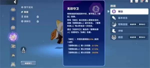 香蕉煎饼饼干定位为极具特色的“辅助型输出手”。其玩法精髓完全依赖于被动技能【无敌守卫】:每当技能或绝招命中敌人,便会为其附加【锁定】标记。被锁定的目标受到任何攻击时,都会触发香蕉机器人自动进行协同攻击。