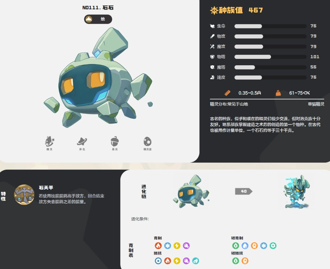 追溯其起源,石石族实则是地系部族在彻底掌握并运用了高阶建筑与创造法术后,成功塑造出的第一个完整的生命形态。这一成就意义重大,不仅是地系魔法工艺的巅峰体现,更被视为该部族文明进步的关键里程碑。值得一提的是,在远古的洛克王国社会体系中,石石还曾扮演过一个非常特殊的角色——成为公认的官方计量标准之一。根据流传下来的古籍资料换算,一个成年石石的基准体重,恰好被定义为约等于三十千克。因此,他们不只是被魔法创造的生物,更堪称是一把行走于世的、具有生命力的“重量标尺”。