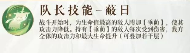当庞羲担任队长时,技能“蔽日”的效果在开场便立即显现。战斗开始时,敌方阵营中生命值最高的单位会被标记【垂荫】,攻击力受到直接削弱。且每当该目标受到伤害时,我方全体成员的攻击力与最大生命值都将获得可叠加的提升。因此,庞羲队长流的战术思路非常明确:开局集中火力攻击被标记目标,在削弱强敌的同时为全队累积属性优势,属于典型的“以战养战”、越打越强的滚雪球战术。