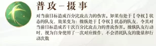 接下来分析普通攻击“摄事”。其效果分为两种情形:若队伍中无人处于【夺权】状态,则由庞羲自身进行常规攻击;一旦有队友正享有【夺权】,庞羲便会“操纵”该队友,使其对目标发动额外数次的普攻打击。关键在于,此次操纵视为庞羲发起的普攻,既不消耗被操纵队友的能量点,也不占用其本回合的行动机会。这实质上是一种高效的“借力打力”,利用队友资源创造额外输出,而自身成本为零,性价比极高。