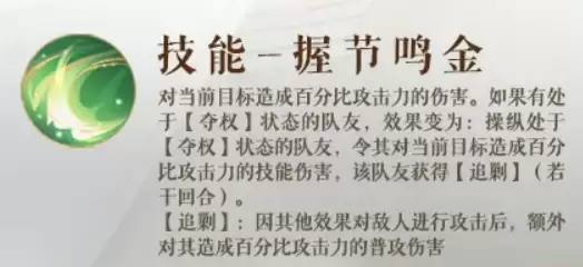 技能“握节鸣金”遵循相似的判定逻辑。无【夺权】队友时庞羲自行攻击,有时则操纵队友发动技能伤害。此外,被操纵的队友还会额外获得持续若干回合的【追剿】状态。此状态效果在于,队友每次通过其他效果对敌人造成伤害后,都会追加一次普通攻击。虽然单次追加伤害看似不高,但整场战斗累积下来,其带来的额外输出总量极为可观,是提升团队持续伤害能力的重要手段。